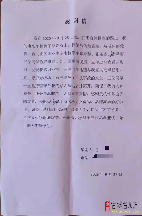 感谢信源自9月25日晚上的一场意外。市民王先生(化名)在枣台路骑电动车回家时,不慎撞上路沿石,重重摔倒后头部受伤昏迷。危急时刻,枣庄交通旅游学校南校的陈家慧、张丽香、洪丽(感谢信中提及,经核实应为孙洪丽)三位同学恰好路过。