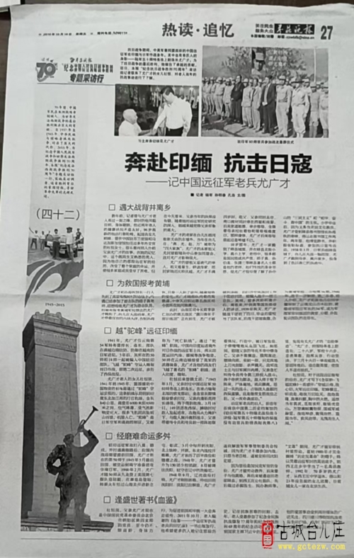 尤广才,1919年9月3日出生于山东台儿庄。1938年,台儿庄战役打响,19岁的他跪别母亲踏上逃难之路,后听闻台儿庄大捷,便决心参军杀敌。他先后成为黄埔军校校第16期学员。1944年4月,尤广才随部队空运入缅甸对日作战,作为中国驻印军50师特务连连长,亲历了西保战役等多场战斗。