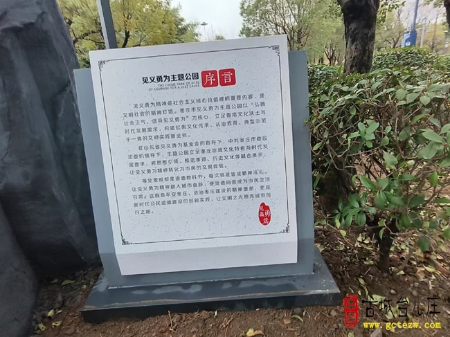 见义勇为是社会主义核心价值观的重要体现,是照亮文明社会的精神灯塔。枣庄市见义勇为主题公园以弘扬社会正气、倡导见义勇为为核心,立足鲁南地域特色与时代发展需求,在山东省见义勇为基金会指导、枣庄市委政法委领导下,打造集文化传承、法治教育、典型示范于一体的文明实践新地标。公园将思想引领、模范事迹、历史文化有机融合,把“见贤思齐”转化为可感可触的文化体验,让每一处景观都成为生动的道德教科书,每一次驻足都成为深刻的精神洗礼,推动崇善向善成为市民的日常自觉。