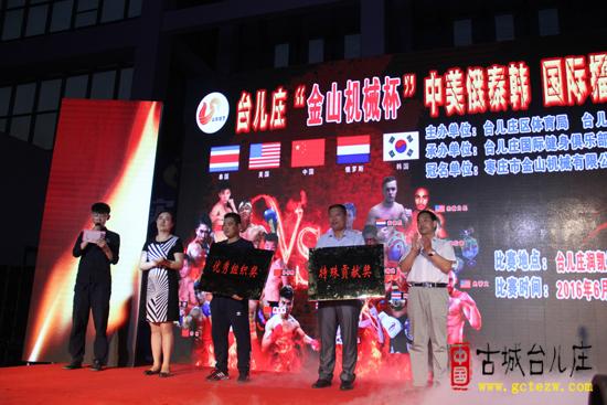中美俄泰韩国际擂台争霸赛在古城台儿庄擂响战鼓(图) 6月18日晚7:00时,台儿庄“金山机械杯”中美俄泰韩国际擂台争霸赛在枣庄市台儿庄区润凯篮球馆擂响战鼓。本次比赛由台儿庄区体育局、台儿庄区体育总会主办,台儿庄国际健身俱乐部承办,枣庄市金山机械有限公司冠名。出席本次比赛的领导有区委常委、区政府副区长李晓红,市体育总会副秘书长孟宪水,区体育局局长栗广强,区民政局副局长李兴玉,区体育总会会长王光国,WBO世界拳击组织中国区副主席、CBCA中国区副主席潘信功。 本次比赛共八场,分别由来自美国纳兰泽对抗中国山东段虎、泰国杰安对抗中国山东周文东、中国辛旭对抗中国刘义、俄国奥利对抗中国山东李明、中国刘成军对抗中国荣其辉、韩国艾宝法对抗中国山东张长青、美国卡尔对抗中国山东孙伟鹏、中国王子龙对抗中国王帅。 本次比赛将传统武术和体育竞技精神有机融合起来,充分展示了武术散打的技击性、对抗性和观赏性,为广大观众奉上了一场视听盛宴,也为弘扬武术精神,推动武术竞技的传承与发展提供了平台。(台儿庄体育局:邢丽)