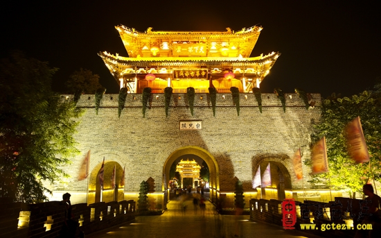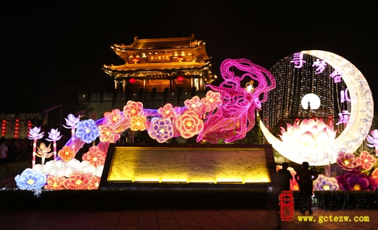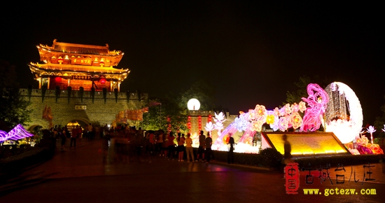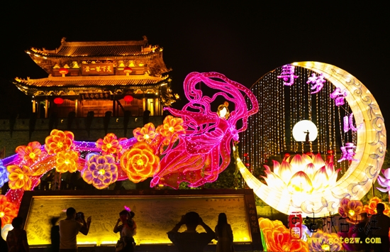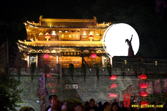 在西门城墙上,高挂着一个直径5米的超级人造月亮,嫦娥在优美的背景音中,时而在月亮中翩翩起舞,时而轻挥衣袖奏起古筝,呈现出天上一个月亮,凡间一个月亮的唯美景观。“嫦娥仙子”摇曳的的身姿映射在幕布之上,与空中明月相互辉映,如梦如幻,分不清天上人间。呈现一番“人在月中舞,曲在空中鸣”的唯美景象。