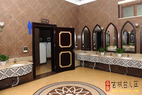 台儿庄古城合理规划设计,保证厕所间隔不超过200米,厕所台阶处设立残疾人专用通道,并安排专人对洗手间进行管理,在厕所门口两侧设吸烟区,入口内侧设有监督服务台,通过游客监督提升洗手间管理水平;休息区域摆放藤椅、藤桌,配备饮水机、手机加油站、电视、空调等供游客免费使用。洗手盆处张贴“节约用水”,厕所内部配备音响、景区厕所专用香薰炉等设施,为游客如厕提供一个爽心宜人的环境;厕所蹲位内设置不锈钢扶手,小便池处张贴“文明如厕”提示语,上端张贴古城大战文化、中华传统美德小故事、二十四孝等宣传画,让游客在如厕的同时,接受古城文化和中国传统文化的熏陶。