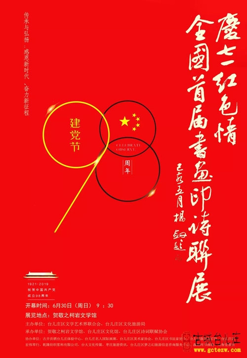 “庆七一红色情”:全国首届书画印诗联展将于6月30日开幕(图) 为庆祝中国共产党建党九十八周年,纪念中华人民共和国建国七十周年伟大盛典,同时继承弘扬中华传统文化,由台儿庄区文学艺术界联合会、台儿庄区文化和旅游局主办,贺敬之柯岩文学馆、台儿庄区文化馆、台儿庄区诗词联赋协会承办的庆七一红色情——“青徐之下:全国首届书画印诗联展”,将于6月30日正式开幕。