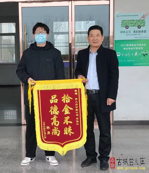 台儿庄区古城公交:雷锋精神似春风,拾金不昧暖人心(图) 近日,台儿庄区古城公交公司收到一面印有“拾金不昧,品德高尚”的锦旗。据了解,该公司驾驶员周传刚在驾驶公交车行驶至台儿庄汽车站站点时,发现乘客丢失的价值7000余元的苹果手机一部。到湿地终点站休息时机主打来电话,周传刚核实情况后让机主在原地等候,在公交车返回至约定站台时把手机交还给失主。失主为表达对周传刚同志拾金不昧的行为表示感谢,向台儿庄古城公交公司送来了锦旗。 (古城台儿庄网要闻部编辑)