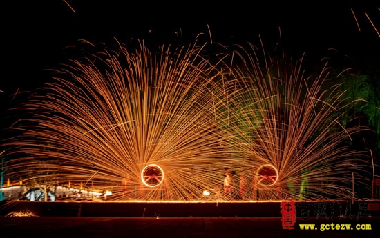 山东省枣庄市台儿庄古城每天晚上都会上演火龙钢花的非遗演出,温度高达1500摄氏度的铁水被抛至高空,瞬间绽放成朵朵“钢花”,宛如千万颗流星划破夜空,让游客大饱眼福。(孔闯)