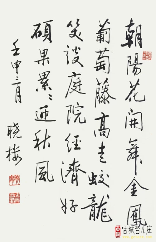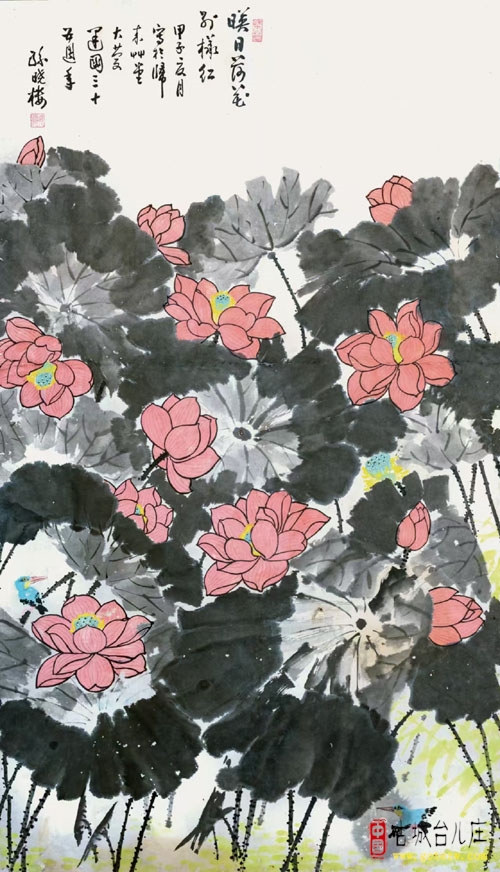 孫晓楼,原名晋旭,别号啸霞,1919年生,山东省棗荘市台儿庄人。自幼喜爱书画,1934年在济南正谊中學上學時,在蒙師臧仲文的教導下研習花鸟画。作品具有形神兼備、清丽.新颖的个人艺术风格。书法先学颜鲁公,後涉獵各家;五十年代後学二王,亦清秀遒劲。
