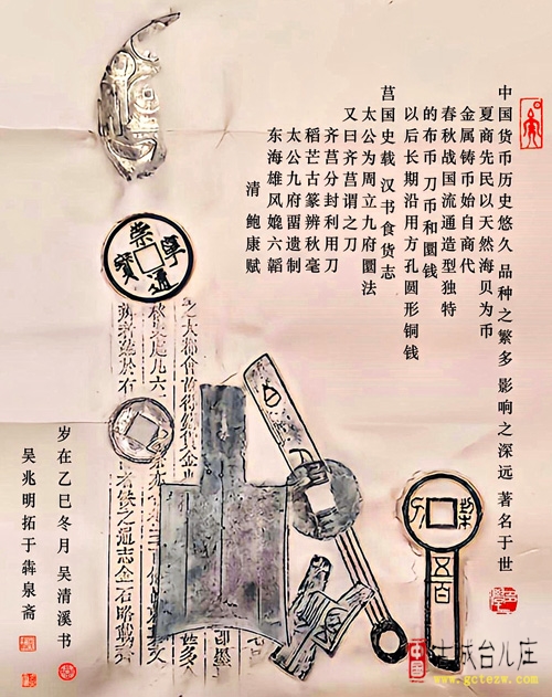 临江仙·观吴兆明老师货币拓画 贝币初通商周岁,刀布随后登场。 圜钱方孔历悠长。 莒疆留古篆,齐府见遗章。 乙巳冬寒拓珍迹,犇泉斋里凝香。 清溪题字韵飞扬。 太公规尚在,一帧话沧桑。 2025年11月10日