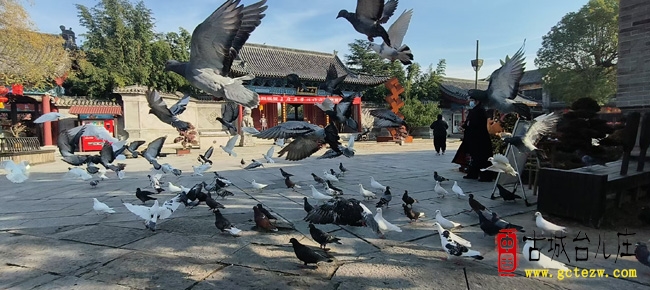 台儿庄古城参将署门前成为一片灵动的天地——成群和平鸽时而振翅盘旋,时而在地面踱步,洁白羽翼与古色古香的署衙建筑相映成趣,引得不少游客驻足投喂、拍照记录。随着鼓点响起,“盘鼓舞”表演正式开场,舞者身着特色服饰,以刚柔并济的动作演绎盘古开天辟地的古老传说,肢体语言中满含力量与韵律,将传统文化的厚重感与艺术表现力巧妙融合,现场掌声此起彼伏。