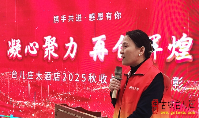(黄振 报道) 12月8日下午,台儿庄大酒店隆重召开2025年秋收战役总结表彰会暨2026年开门红战役启动大会,全体同仁身着统一红色马甲参会,共同复盘秋收战役辉煌战果,誓师开启开门红新征程,会议由管小燕主持。