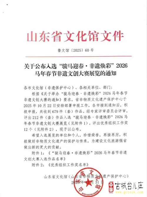台儿庄区泥沟青花布印染技艺是我区极具特色的省级非物质文化遗产项目,此次入选的《青花布文创玩偶》,既延续了该技艺蓝白相间的经典韵味,又紧扣马年春节主题进行创新设计。作品不仅展现了泥沟青花布印染技艺的独特魅力,更将传统非遗与现代文创需求相结合,成为我区非遗保护与创新发展的生动缩影。 (古城台儿庄网要闻部编辑) 上一篇:于景志:戎装换警服 初心映荣光[ 01-07 ]下一篇:济枣高铁新龙山隧道顺利贯通 全线18座隧道已有6座实现贯通 其…[ 01-08 ]