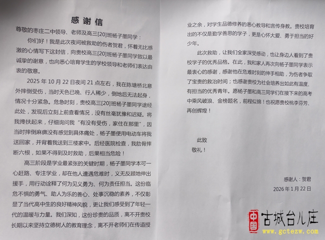 一封感谢信,承载着无限敬意;一次善举,彰显着育人初心。枣庄二中用十余年的坚守证明,优质教育不仅能培育出勤学善思的学子,更能塑造心怀大爱、勇于担当的时代青年。当崇高精神成为校园文化的核心底色,当真善美正成为师生的行为准则,教育便有了直抵人心的力量。愿这份崇高精神持续传递,让更多二中学子在成长路上收获品格与学识的双重成长,让正能量照亮更远的征程。