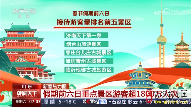 六、主流媒体多次聚焦,宣传营销亮点纷呈假日期间,台儿庄良好的旅游环境、丰富多彩的主题活动不仅吸引了众多游客纷至沓来,还吸引了主流媒体、自媒体等多频次聚焦。全网宣传矩阵累计曝光超亿人次,#过年就来台儿庄吧##千年古城迎新春体验不一样的年味#等话题引爆社交平台,央媒及省级主流媒体聚焦报道超百次,运河年味香飘全国。重点A级景区累计获央视报道13条,省级以上报道80余次;自媒体矩阵发布图文视频300余条,抖音景点人气榜、亲子出游人气榜第一名,“最年味,是山东!”全国广电联盟融媒联动直播活动全网总传播量超亿次,以全媒体传播力擦亮古城金字招牌。