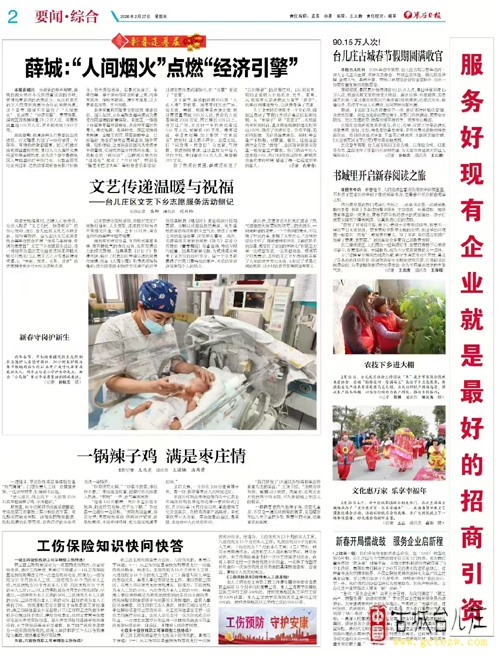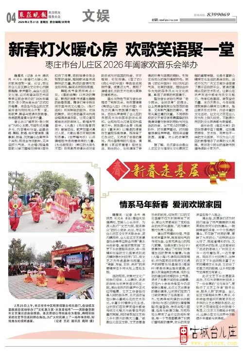 【枣庄日报/枣庄晚报综合专稿】文化惠民暖人心 马年新风谱新篇-台儿庄区新春文艺活动点燃新春激情(图)同林摄影:新春佳节,古城台儿庄处处洋溢着昂扬向上的喜庆氛围。近日,台儿庄区接连举办多场高水平文艺活动,从乡村田野到社区广场,文化的力量传递着温暖与祝福。2月27日,相关活动盛况分别在《枣庄日报》《枣庄晚报》刊发,成为马年新春一道亮丽的风景线。